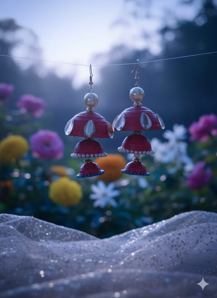 Bold, festive, and beautifully detailed — these red and yellow quilled jhumka earrings are an eye-catching blend of handcrafted layers, gleaming crystal drops, and soft pearl accents. Each pair is made entirely by hand, giving it a delicate charm while remaining feather-light for all-day wear. A perfect accessory for weddings, festivals, and anyone who loves traditional jewellery with a modern handcrafted twist.